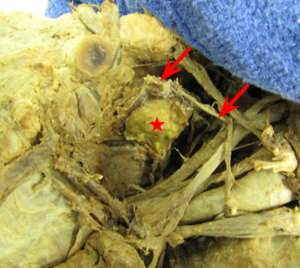 In 2018, the authors at the Michigan State University Prosection Lab identified the tumorous mass postero-inferior to the right clavicle in the body of a male cadaver donor in his 70s-80s. The lateral location and depth of this mass was considered atypical; and because it compressed a brachial plexus nerve, the authors strongly believed that the mass would have presented an alternative set of symptoms not typically described by individuals with NTOS. To gather more information, the authors retrospectively investigated the donor’s clinical history to determine what kinds of documented symptoms this man had experienced and/or whether he had received any conservative or surgical intervention.