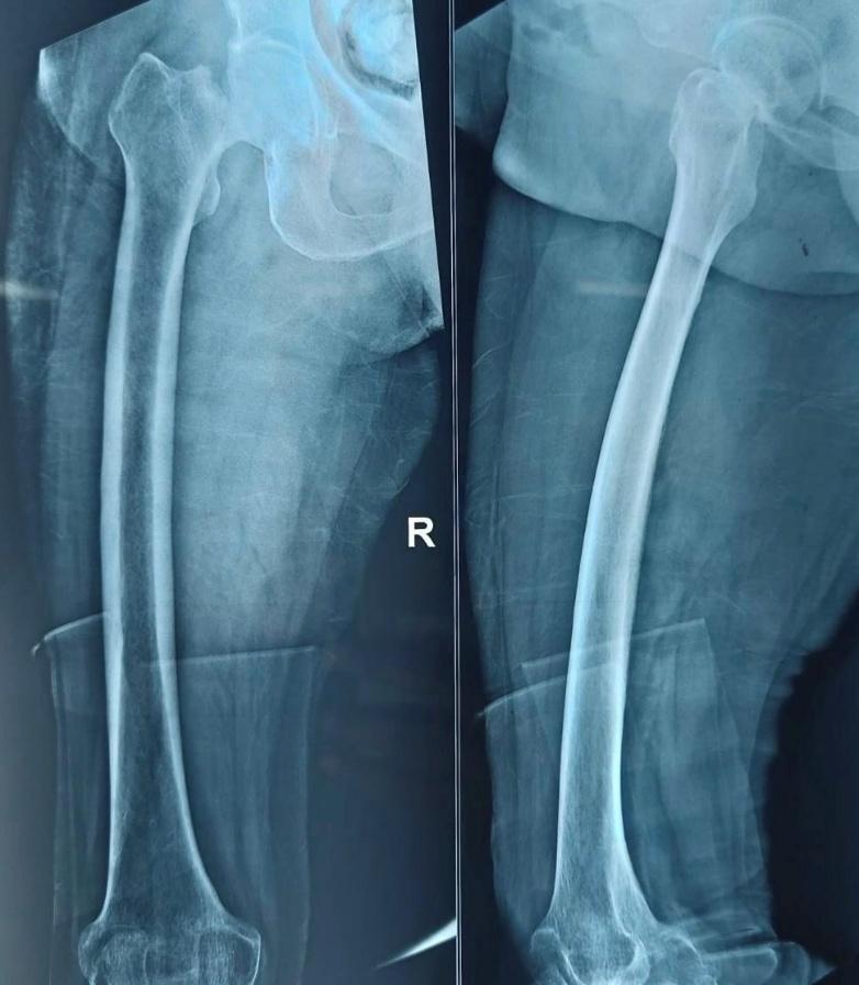 All patients underwent detailed history taking, comorbidity assessment, and clinical examination. Standard radiographs (anteroposterior pelvis and lateral hip views) were obtained. Laboratory evaluations included hemogram, renal and liver function tests, ECG, and chest radiography. Preoperative counseling explained expected outcomes and postoperative rehabilitation. A representative preoperative fracture radiograph is shown in Figure 1.