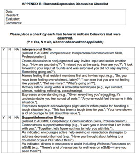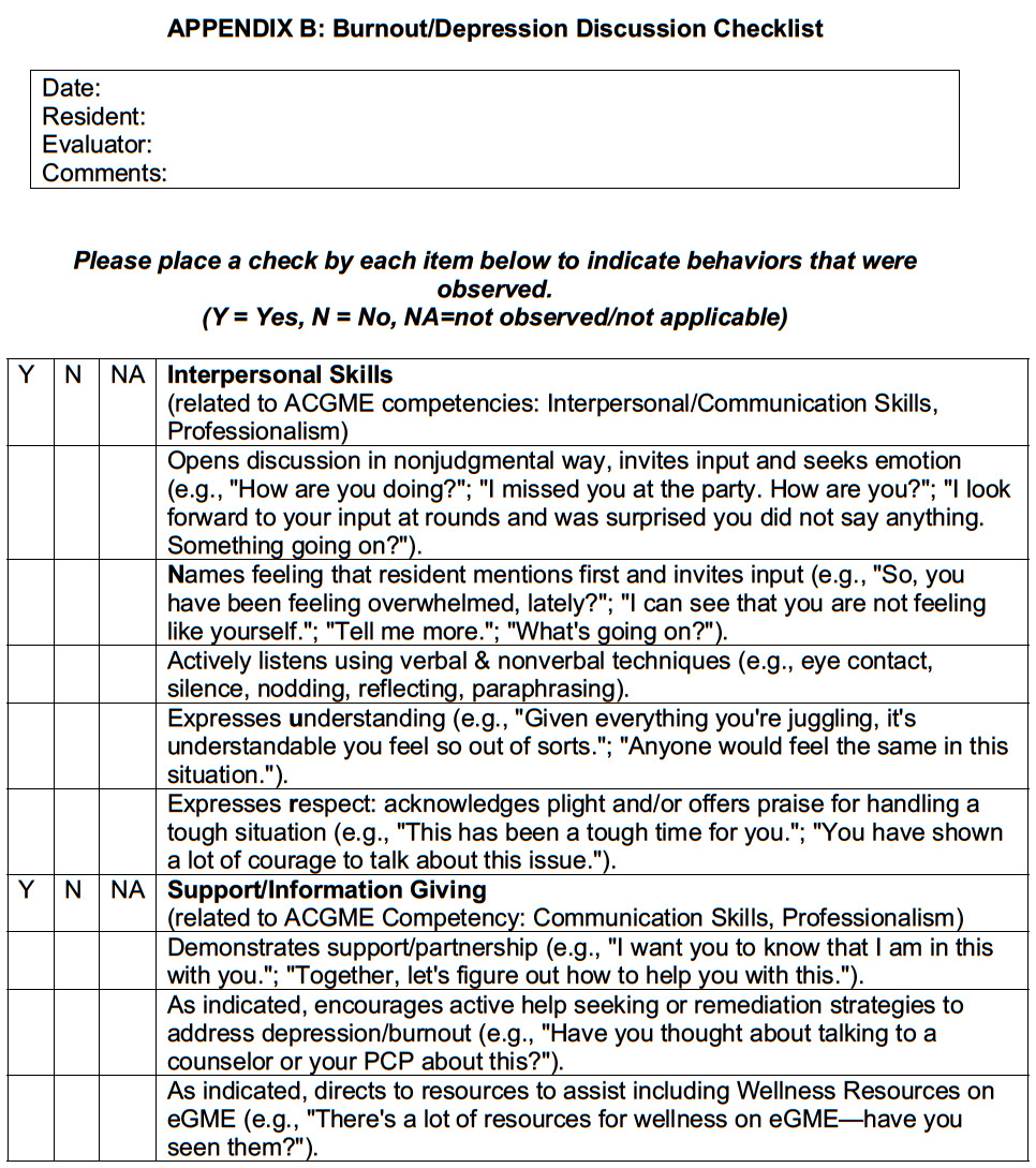 With resident physician burnout and depression rates increasing faster than in the non-physician workforce,1 the Accreditation Council for Graduate Medical Education (ACGME) now includes well-being program requirements for allopathic and osteopathic resident physicians.2 However, limited resources for identification and intervention of burnout exist in many allopathic and osteopathic medical resident education settings.3–5