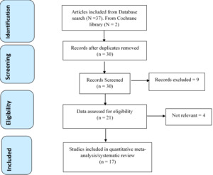 A total of 39 articles were retrieved from the database search. After removing duplicates, the remaining 30 references were assessed for further eligibility. During the process of reading through the abstracts and titles, nine (30.0%) papers were excluded, mainly because of insufficient outcome measures (myocardial infarction, OSA patient only) or insufficient information required for our study.
