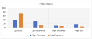 The qCSI scores were significantly higher in the high exposure group, mean 4.6 (SD = 4.4) then the low exposure group, mean 2.1 (SD = 3.2), p = 0.004. The mean difference was 2.5 (CI: 1.5 - 3.5) which is a relative 54% difference. The median risk stratification levels differed significantly (p = 0.006) (Figure 1). There were 27.8% (n = 5) of the high exposure group scoring in the high risk of severity level versus 15.3% (n = 17) of the low exposure group, p = 0.004. The overall crosstabulation between exposure and severity showed that the high exposed group was significantly more likely to have been in the high severity group (27.8%) than the low severity group (15.3%) (relative difference 45%, p = 0.01).
