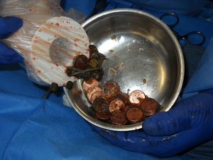 A defibrillator magnet (commonly found at the anesthesia station) was placed into a sterile specimen bag that was then inserted into a gastrotomy incision. The bag was tied at its opening to ensure sterility. As the magnet was inserted and pulled from the gastrotomy, the ferrous-based sharps clung to it, facilitating easy and safe removal (Figure 2). After all of the sharps were removed, the many remaining swallowed pennies were then safely scooped out with a gloved surgical hand. The small intestine was completely examined in surgery and no objects were found to have passed out of the stomach. This also was confirmed by a plain abdominal X-ray done post-operatively. The gastronomy was closed in a standard fashion. The patient had an uneventful post-operative course and was discharged 5 days after surgery.