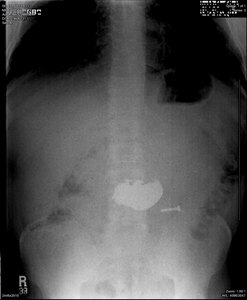 A 51 yo male psychiatric patient suffering depression and alcohol abuse presented to our emergency department on two separate occasions after ingestion of large amounts of foreign materials. Figure 1 demonstrates an abdominal x-ray on one of his admissions. Presentation, physical exam and x-ray findings were almost identical on both admissions, as were the types of materials ingested. The large number of objects made endoscopic extraction impractical and, since the many sharps that were swallowed included nails and screws, surgical removal was required due to fear of perforation.