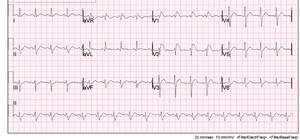 The patient was a 58 year-old male with a history of hypertension, hyperlipidemia and diabetes, who initially presented to our emergency department complaining of a fever, diarrhea and fatigue. According to the patient, these symptoms had been ongoing for the past 5 days. The patient also had a non-productive cough. The patient denied any chest pain, heart palpitations, shortness of breath, syncope, dizziness, or abdominal pain. The patient denied any previous syncopal episodes or any previous cardiac history including dysrhythmias, previous myocardial infarctions, coronary artery disease, or congestive heart failure. The patient denied any family history of early cardiac deaths or family history of heart disease. Review of the patient’s current medications at the time included atorvastatin, lisinopril-hydrochlorothiazide, and metformin.