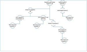 The study hospital was a 475-bed facility without a major competing hospital within a 30-mile proximity. As such, patients enrolled in the study were evaluated for readmission to the ED or the hospital for any reason at 30 days after initial presentation. It was an assumption of the authors that if any study participants had experienced a complication or were symptomatic from a delayed intracranial hemorrhage that the most available hospital with facilities capable of managing such complications would be the study hospital.