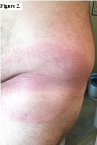 Per the original ED records, initial physical examination was only pertinent for mildly diaphoretic skin with an egg-shaped erythematous rash on his anterior left hip and groin measuring 26 cm. with central clearing, or area void of red coloration (see Figure 2). The rash was neither tender nor warm to palpation. The patient had intermittent bradycardia in the 50s, and his vital signs were otherwise within normal limits.