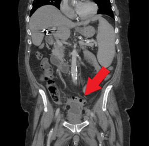 Orthopedics was the first service to evaluate the patient on hospital Day 2 and ordered a CT of the abdomen and pelvis with contrast. This study found that superior to the bladder, there was a 4.9 x 3.8 cm fluid collection with peripheral enhancement concerning for abscess. (Image 2) Internal Medicine then evaluated the patient and reviewed the results of the CT scan. Blood cultures were obtained and the General Surgery service was consulted. A repeat CT with oral contrast was ordered by General Surgery on hospital Day 3. This test showed that the adjacent loops of the intestines along the anterior and superior margin of the fluid collection were partially opacified without obvious extravasation of oral contrast in the region, suggesting fistula (i.e., communication with the bowel). (Image 3)