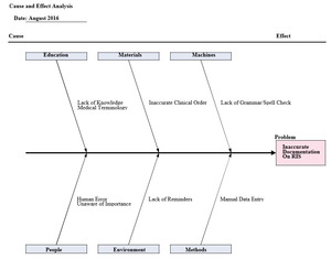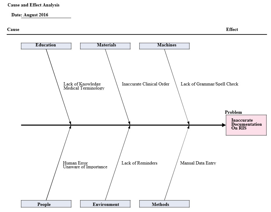 Following Phase I, a meeting was conducted with four administrators, the authors, and the department chair. A root-cause analysis, shown in Figure 2, was used to determine the possible etiologies for transcription discordance between the imaging order information and the information transcribed into the RIS.