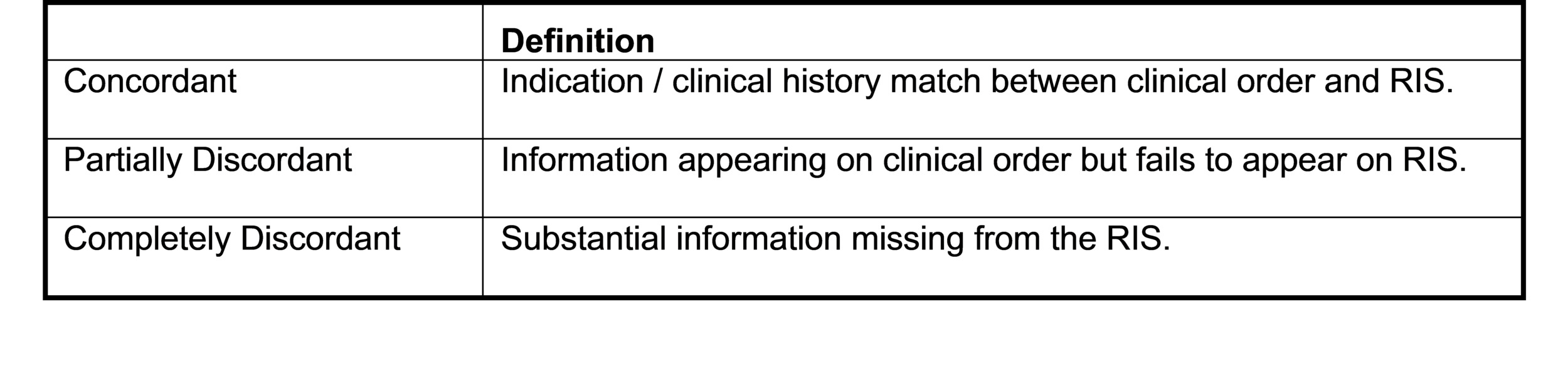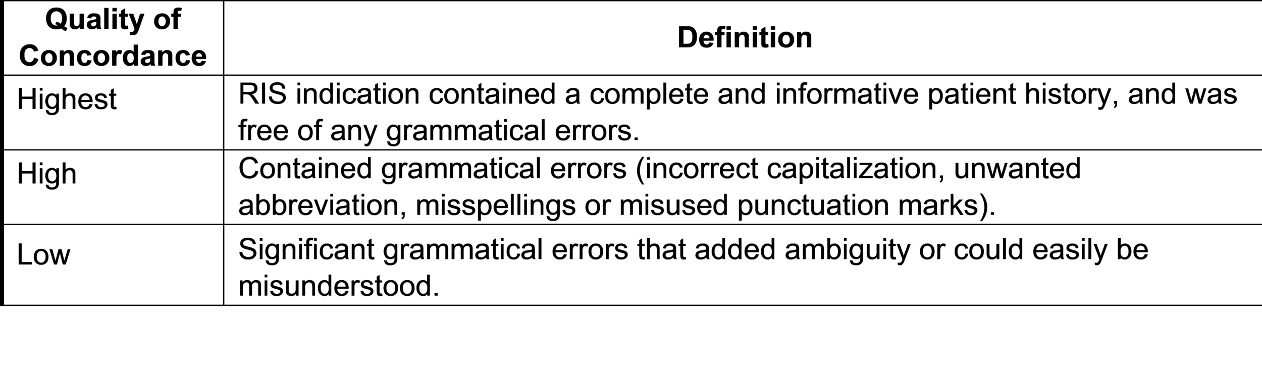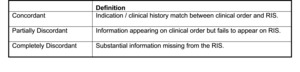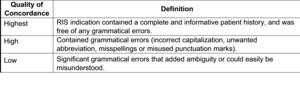 Concordant and partially concordant imaging orders were also assessed for quality of concordance. Quality of concordance was categorized as “highest” if transcribed information matched the clinical order verbatim, contained a complete and informative patient history, and was free of any grammatical errors. The quality of concordance was categorized as “high” if transcribed information was concordant but contained grammatical errors (e.g., incorrect capitalization, non-standard abbreviation, misspellings or misused punctuation). The quality of concordance was categorized as “low” if information in the RIS was partially concordant with the actual imaging order but failed to provide a complete or accurate patient history. Also categorized as low concordance were records with significant grammatical errors and/or omissions that contained ambiguities that could not be readily interpreted by the RIS auditor.