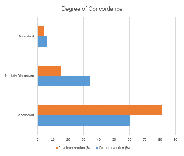 A total of 266 (60%) of Phase I imaging order documentation records were found to be perfectly concordant, meaning that the content provided for the indication and clinical history was identical between the imaging order and RIS documentation. Phase II demonstrated 374 (81%) perfect concordance, a 21% post-intervention increase (p < 0.001). A total of 121 (34%) of RIS documents from Phase I were partially discordant, meaning the order indication and patient history information was partially but inadequately transcribed compared to 68 (15%) during Phase II (p < 0.001). A total of 24 (6.0%) Phase I RIS documents were discordant, meaning substantial information was missing, compared to 19 (4%) during Phase II (p = 0.271). Overall, the number of partially or completely discordant documents decreased by 44% after intervention (p < 0.001) (Figure 3).