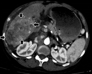 Regarding the treatment of HCC, clinical evidence suggests that mass resection with or without lymph node dissection in patients with preserved hepatic function (Child-Pugh class A) is the first step.6 Our patient, however, demonstrated compromised liver function as evidenced by a Child-Pugh score of 11 points (class C) with a total bilirubin of 3.4 mg/dL, albumin of 1.94 g/dL, international normalized ratio of 2.18, lack of ascites, and the grade 2+ encephalopathy with behavioral changes. Furthermore, she did not meet the Milan or University of California San Francisco liver transplant criteria as she had an involvement of the right main portal vein and its proximal and anterior branches. The latter also made mass resection a less feasible option.